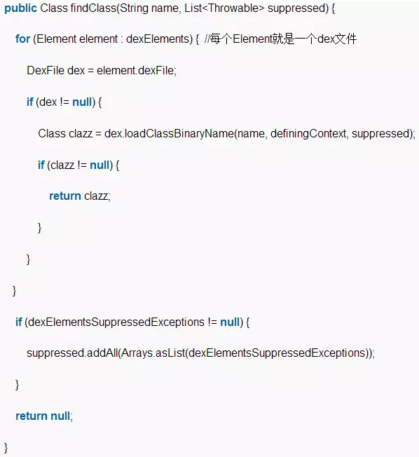 - 一个BaseDexClassLoader可以包含多个dex文件,每个dex文件是一个Element,多个dex文件排列成一个有序的数组dexElements,当找类的时候,会按顺序遍历dex文件,然后从当前遍历的dex文件中找类,如果找类则返回,如果找不到从下一个dex文件继续查找。